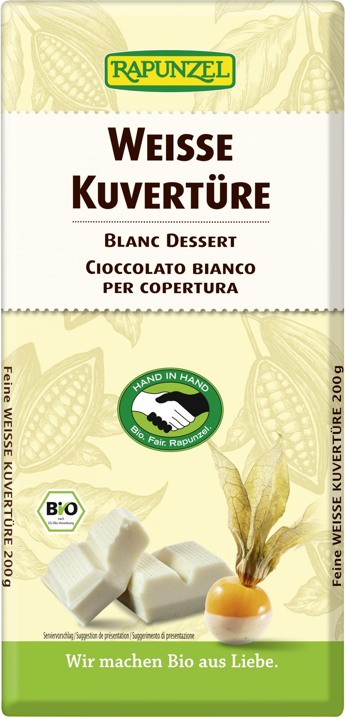 Was wären Pralinen, süße Früchte oder feines Gebäck ohne diesen zart schmelzenden Überzug aus glänzender Schokolade? Wunderbar aromatische Kakaobutter und Vollmilch mit einem Hauch Bourbon Vanille verfeinern Ihre Kuchen, Gebäcke und Pralinen. Die Kuvertüre wird aus fair gehandeltem Kakao und Zucker hergestellt und ist ein Produkt des Rapunzel HAND IN HAND-Sortiments.