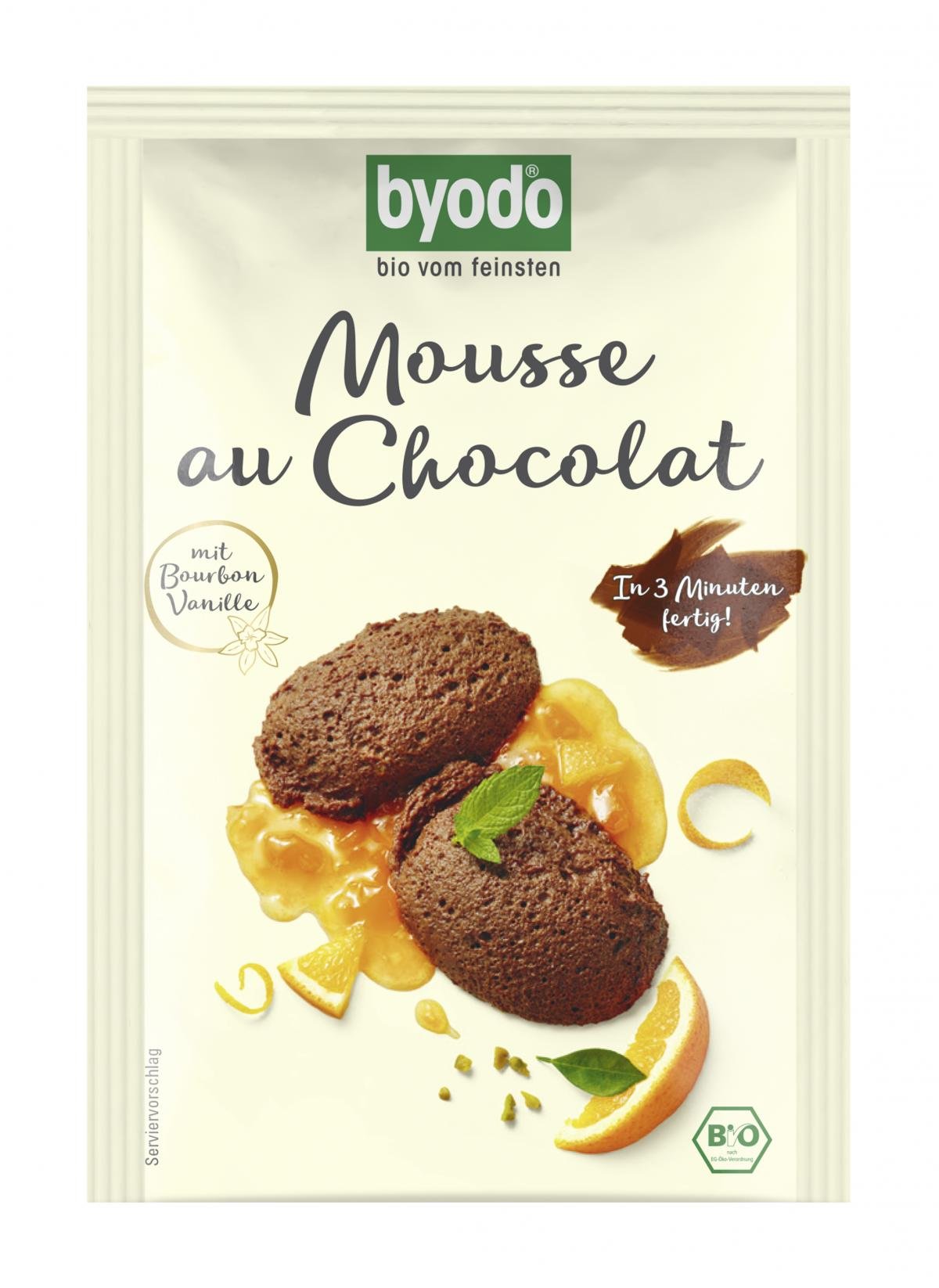 Für die Byodo Mousse au Chocolat werden die sorgsam ausgewählten Bio-Zutaten wie echte Bourbon Vanille zu feinem Pulver vermahlen. Zucker oder ein anderes Süßungsmittel kann nach Belieben hinzugefügt werden. Kombiniert mit kalter Sahne und kalter Milch und in 3 Minuten mit dem Handrührgerät luftig aufgeschlagen wird daraus im Nu ein wunderbares Dessert, das jeden Genießer begeistern wird. Die leckere Bio-Nachspeise ist frei von Gelatine.