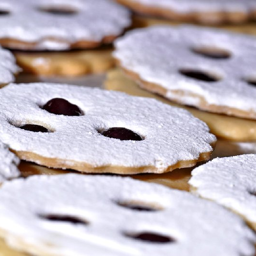 Mürbeteig (WEIZEN-Mehl, BUTTER, Zucker, EI, Salz), Marmelade, Staubzucker