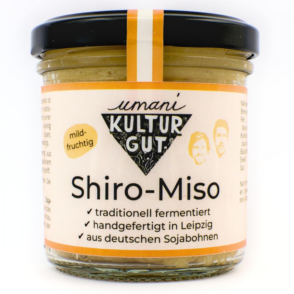 Sojabohnen aus Deutschland, Reis aus Italien. Traditionell reift Shiro-Miso für 2-3 Monate in Holzfässern zu einem mild-fruchtigen Aroma. Seine Zutaten sind Koji, welches in einer ersten 2-tägigen Fermentation mit einer Koji-Kultur aus Reis hergestellt wird, und ein weiteres Substrat, wie beispielsweise Sojabohnen oder Lupinenkerne. Salz dient als Konservierungsmittel. In der Küche entfaltet Miso seinen umami-Geschmack am Besten in einer Miso-Suppe. Aber auch allgemein zum Würzen, Verfeinern oder sparsam als Brotaufstrich ist es sehr gut geeignet.