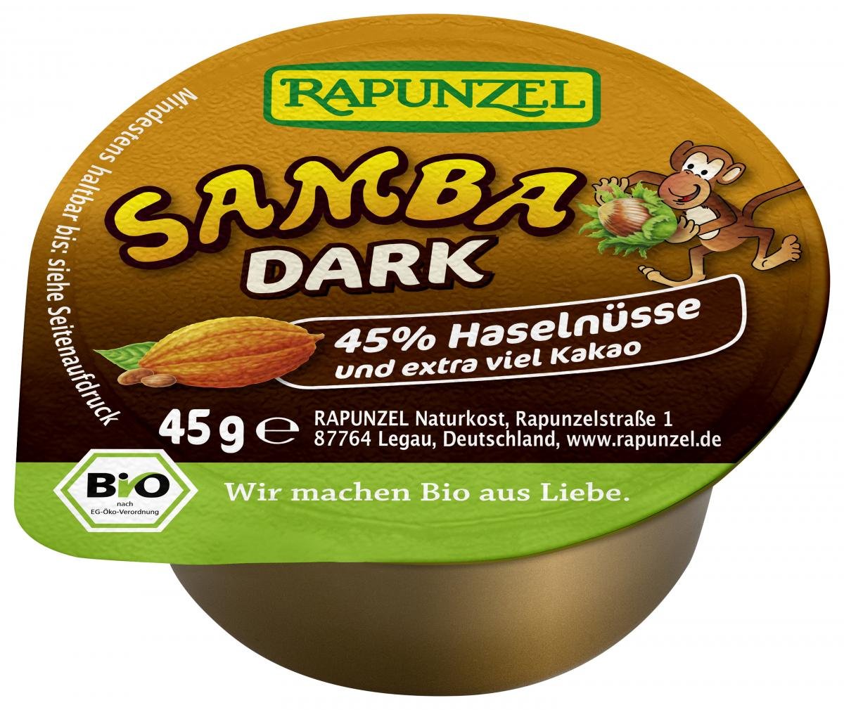 Samba Dark - Frühstücksgenuss für alle Zartbitter-Schoko-Fans! 45% aromatisch geröstete Haselnüsse lassen das Herz eines jeden Nuss-Fans höher schlagen! Zusammen mit extra viel fein aromatischem Kakao, wertvollem Rapadura Vollrohrzucker und edler Bourbon Vanille werden sie von sorgfältig zum zart schmelzenden Samba Dark verarbeitet. Rapadura Vollrohrzucker, Cristallino Rohrzucker, Palmöl und Kakaopulver sind fair gehandelt und stammen von unseren HAND IN HAND-Partnern. Die Konsistenz ist temperaturabhängig. Bei Zimmertemperatur cremig, im Kühlschrank gelagert fest.