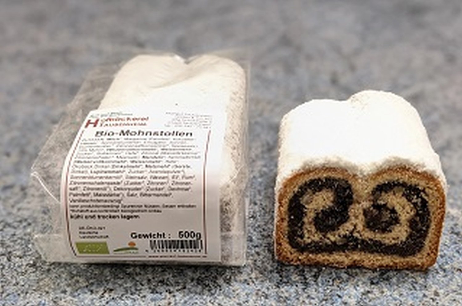 MILCH, Margarine, Mohn, WEIZEN-Vollkornmehl, WEIZEN-Mehl, Zucker, Sultaninen, Hefe, Zitronat, MANDELN, Semmelbrösel (enth. WEIZEN, DINKEL, GERSTE, LUPINE), EI, Rum, Zitronenschalenpaste, Dekorzucker, Salz, BITTERMANDEL, Vanilleschotenauszug