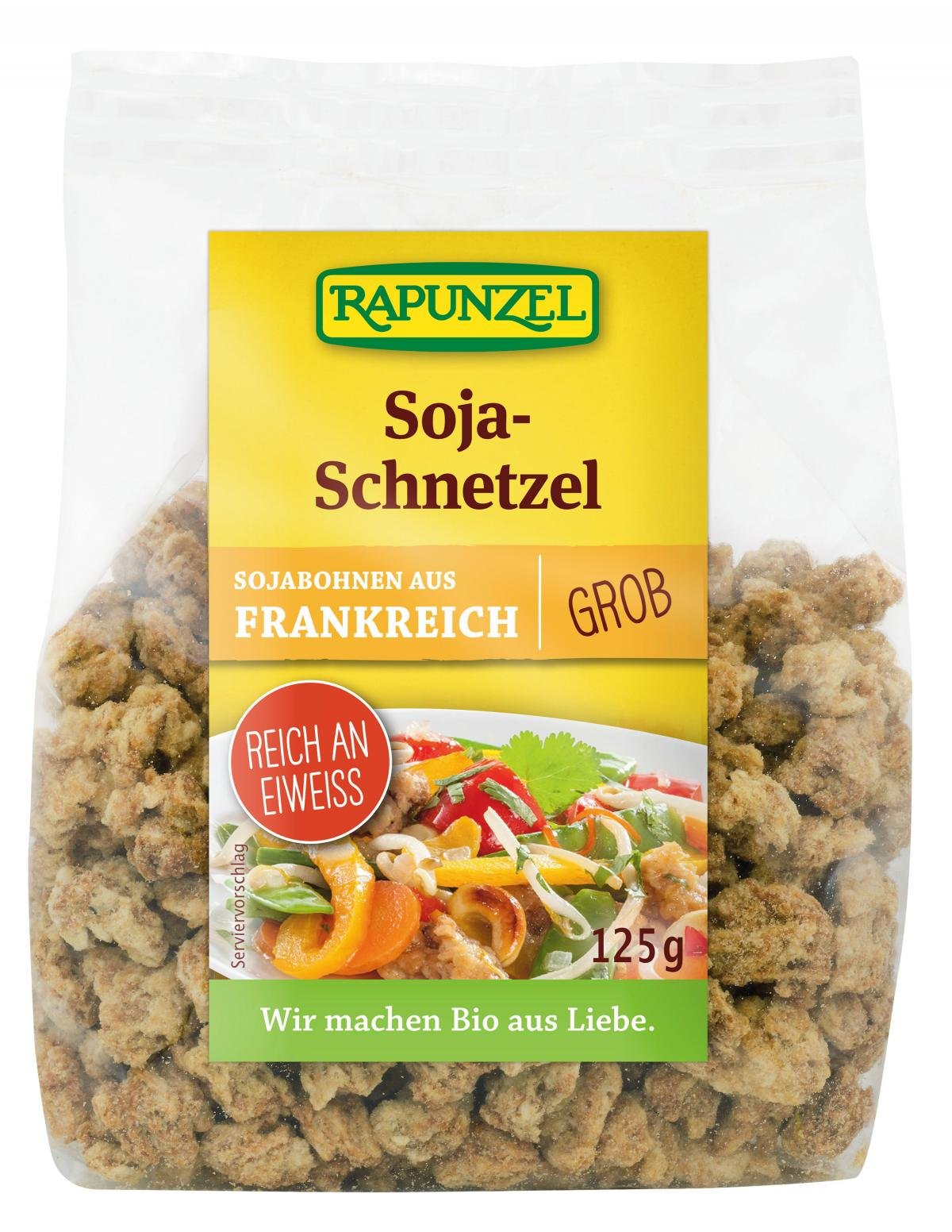 Pflanzlicher Fleischersatz - vielseitig verwendbar. Aufgrund ihres hohen Proteingehalts sind Soja-Schnetzel unverzichtbar in der vegetarischen und veganen Küche. Sie nehmen den Geschmack von Gewürzen sehr gut auf. Gegart ergeben die Schnetzel ca. die 3-fache Menge.