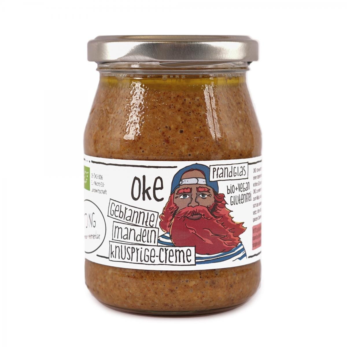 einer steifen Brise Mehrsalz. Das karamell-gekrönte Süß und die Mandelstückchen machen OKE zu einem Erlebnis. OKE passt auch famos zum Müsli, in den Joghurt oder läßt sich gut als Zutat zu Backen benutzen. Wenn sich etwas Öl an der Oberfläche absetzt, rühre OKE gründlich auf, damit er seinen ganzen Charme versprühen kann. **Jahrmarkt