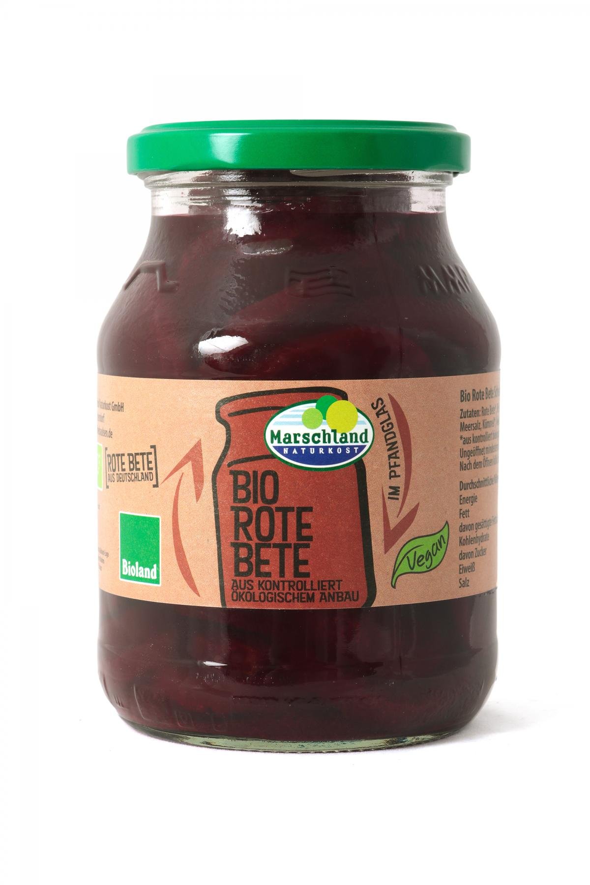 Von Schale und Fehlstellen befreite, gedämpfte in Scheiben geschnittene Rote Bete, welche durch Zusatz eines süßsauren Aufgusses, sowie durch Pasteurisation im luftdicht verschlossenen Behältnis, dauerhaft haltbar gemacht worden ist.