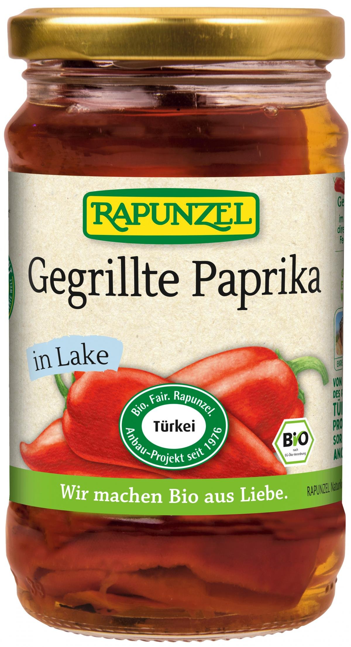 Sonnengereifte Paprika der Sorte 'Capia' aus dem Rapunzel Türkei-Projekt. Die von Hand geernteten Paprikas werden erntefrisch verarbeitet und in einem speziellen Ofen direkt über dem Feuer gegrillt. Das verleiht ihnen den typischen Grillgeschmack. Die Paprikas schmecken aromatisch-fruchtig und sind vielseitig verwendbar.