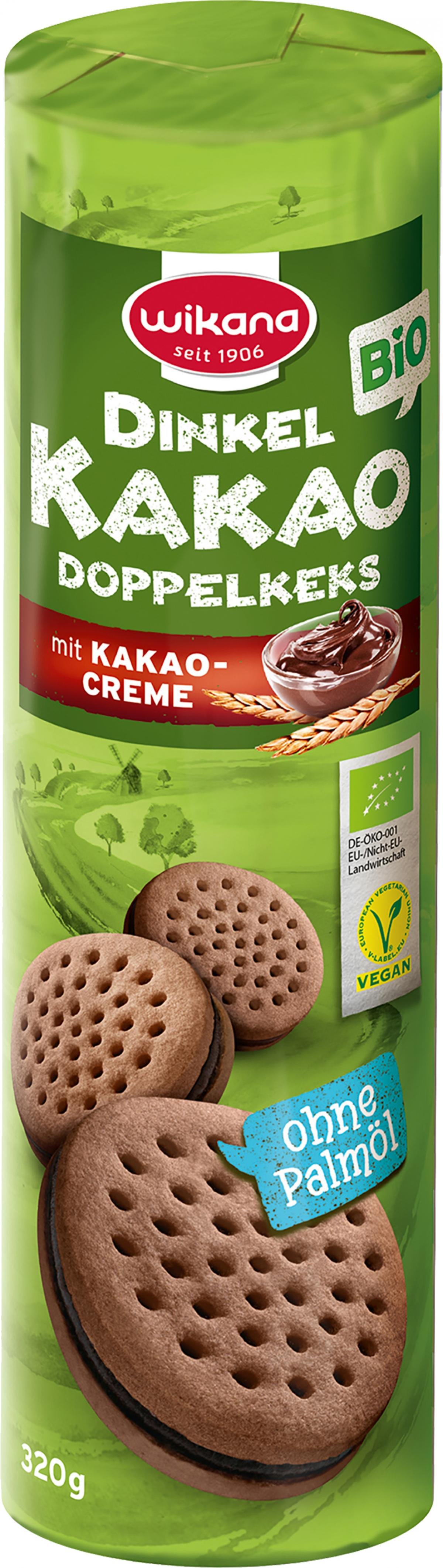 Der Bio Dinkel Kakao Doppelkeks mit Kakaocreme ist ein Doppelkeks aus zwei Kakaokeksen mit einer Kakaocreme gefüllt. Der Keks enthält kein Palmfett.