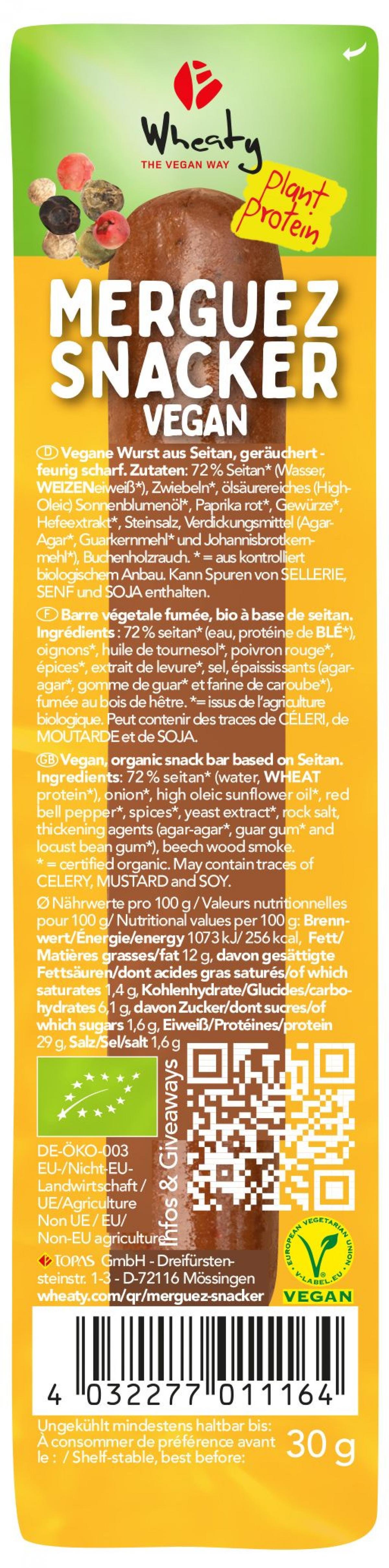 Der Merguez Snacker, mit arabischer Schärfe, die ihr Aroma nachhaltig entfaltet. Ungekühlt haltbar und ein idealer Proteinlieferant. Für Sportler, Macher und aktive Büro- und Homeofficearbeiter. Perfekt gegen den kleinen Hunger, oder als Powerschub für die nächste Herausforderung. Bio-vegan, klimafreundlich und fair in Deutschland vom Vegan-Pionier Wheaty hergestellt.