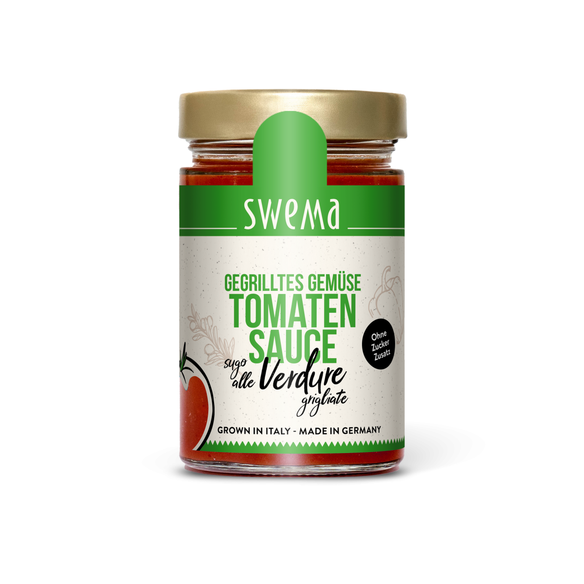 Zutaten: 80% italienische Tomaten, 15% gegrilltes Gemüse (Paprika, Auberginen, Zucchini), Zwiebeln, Olivenöl, Steinsalz, Knoblauch, Rosmarin, Thymian, Oregano.