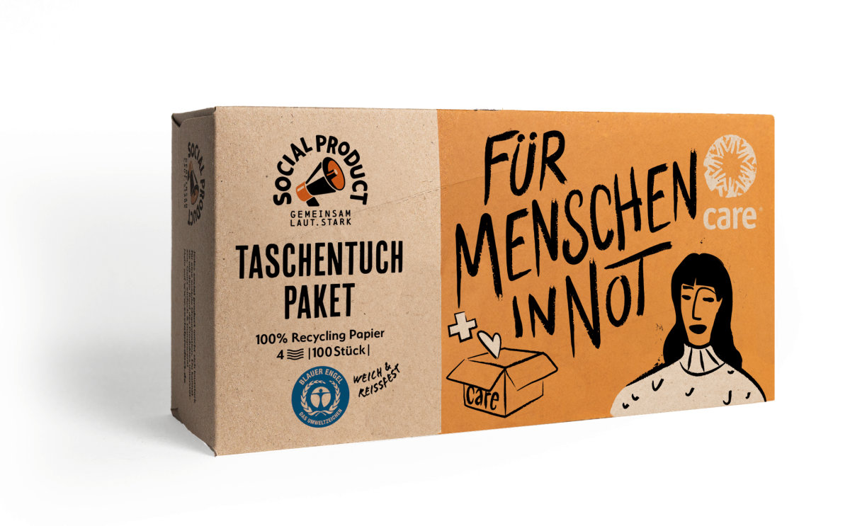 Das social product Recycling Taschentuch-Paket wurde in Kooperation mit der gemeinnützigen Organisation Care Deutschland entwickelt. Die in Deutschland produzierten, aus recycelten Kartons hergestellten Taschentücher sind super weich und reißfest. 0,15 Euro pro verkauftem Produkt fließen in die Arbeit von Care Deutschland e.V.