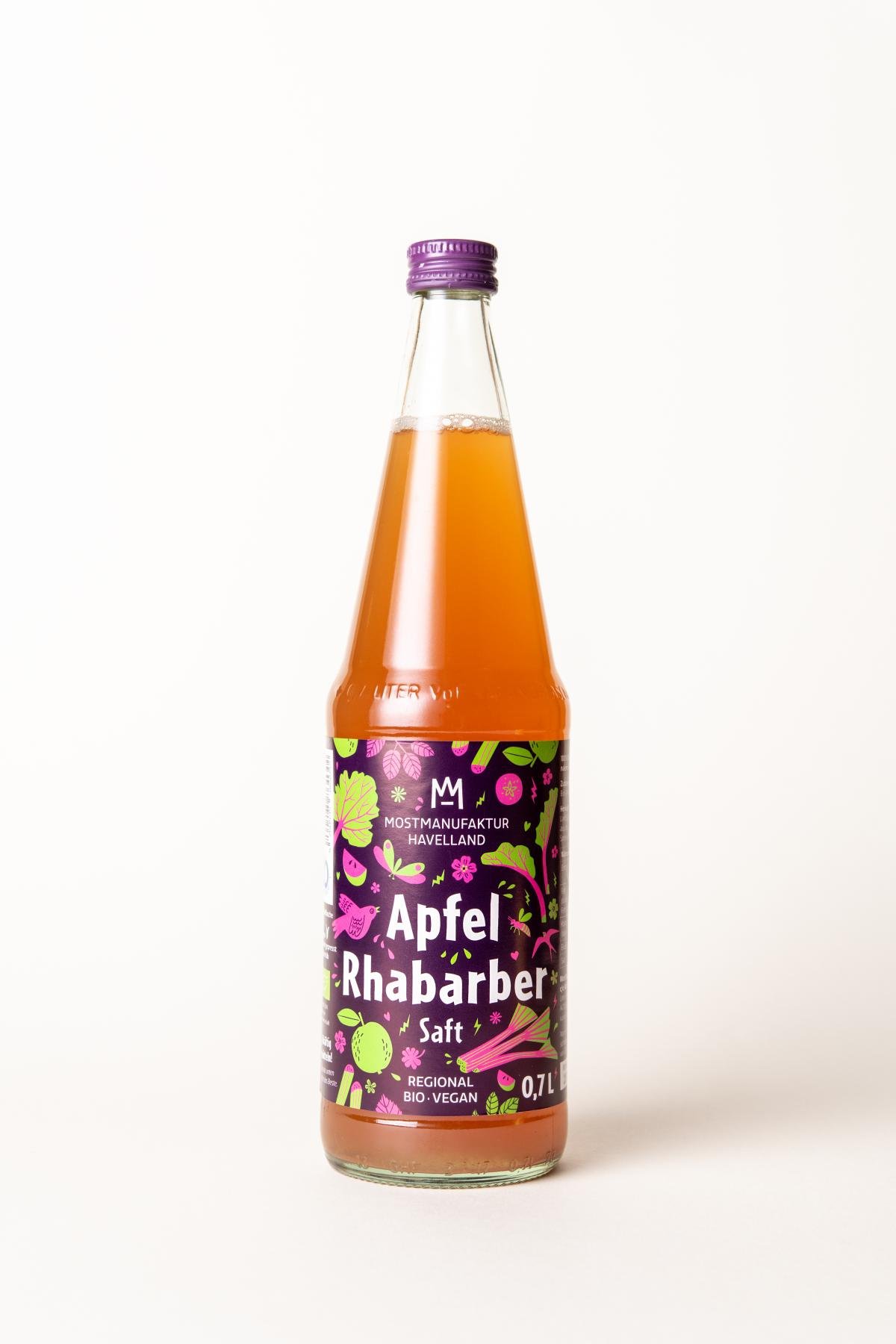 MostManufaktur Havelland Apfel-Rhabarbersaft in Bio-Qualität ist das Sommergetränk schlechthin. Nicht zu sauer aufgrund seines ausgewogenen Mischungsverhältnisses erfrischt dieser Saft gekühlt auch an heißen Tagen wunderbar. Bio-Rhabarber, angebaut in einer sozial-therapeutischen Einrichtung aus der direkten Nachbarschaft zur Mosterei sowie in einem Bio-Betrieb im Wendland, sorgt für die besondere Farbe und den leicht säuerlich-entspannenden Geschmack. Gemischt mit süßem Bio-Apfelsaft aus der Region Werder/Havel ergibt sich eine fruchtige Kombination für jede Gelegenheit.
