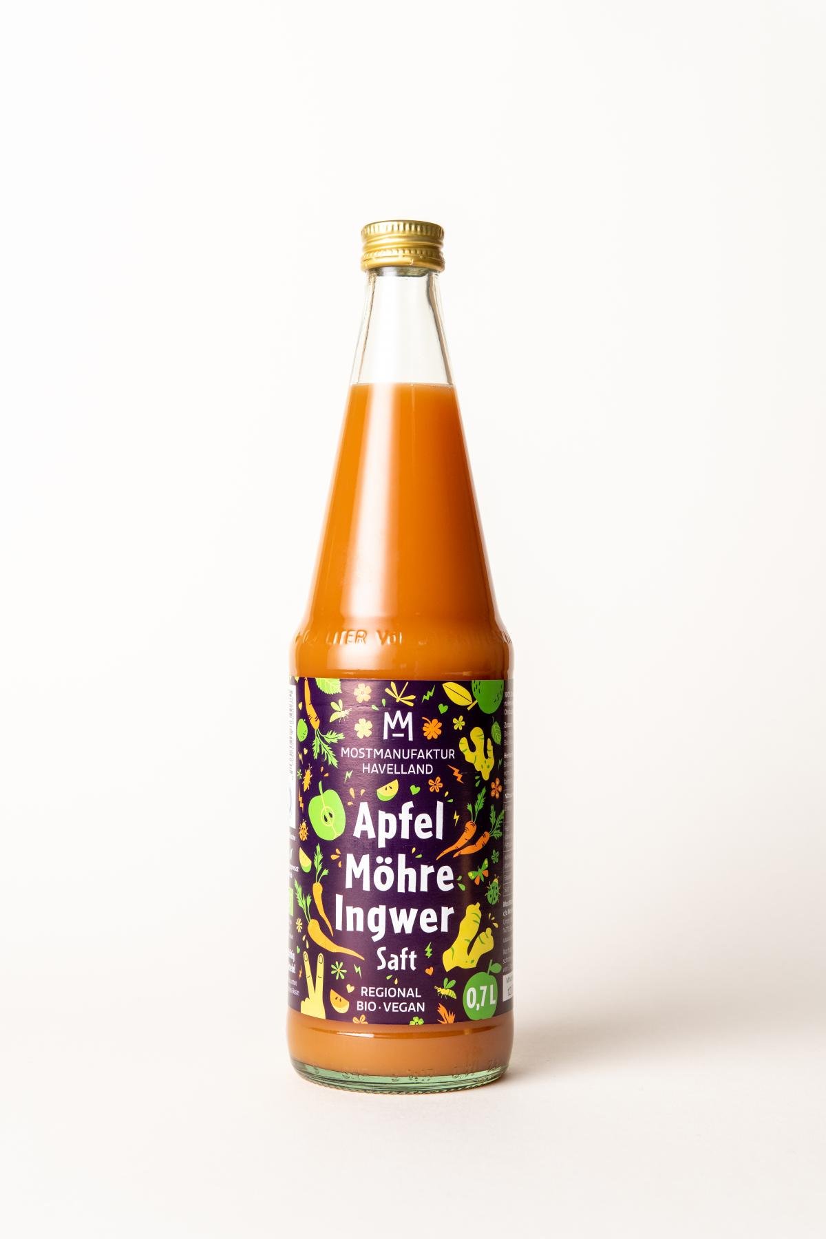Für diesen leicht orange-farbenen Saft mischen wir leckere Brandenburger Bio-Äpfel mit Demeter Möhren aus dem Ökodorf Brodowin und bio-Ingwerpüree aus Thailand. Im Abgang leicht scharf, ist dieser Saft für jeden Ingwerfan ein Muss. Der Bodensatz ist natürlich und bedingt durch das Absetzen der schweren Möhren- und Ingwerbestandteile und kann durch kräftiges Schütteln wieder aufgemischt werden.