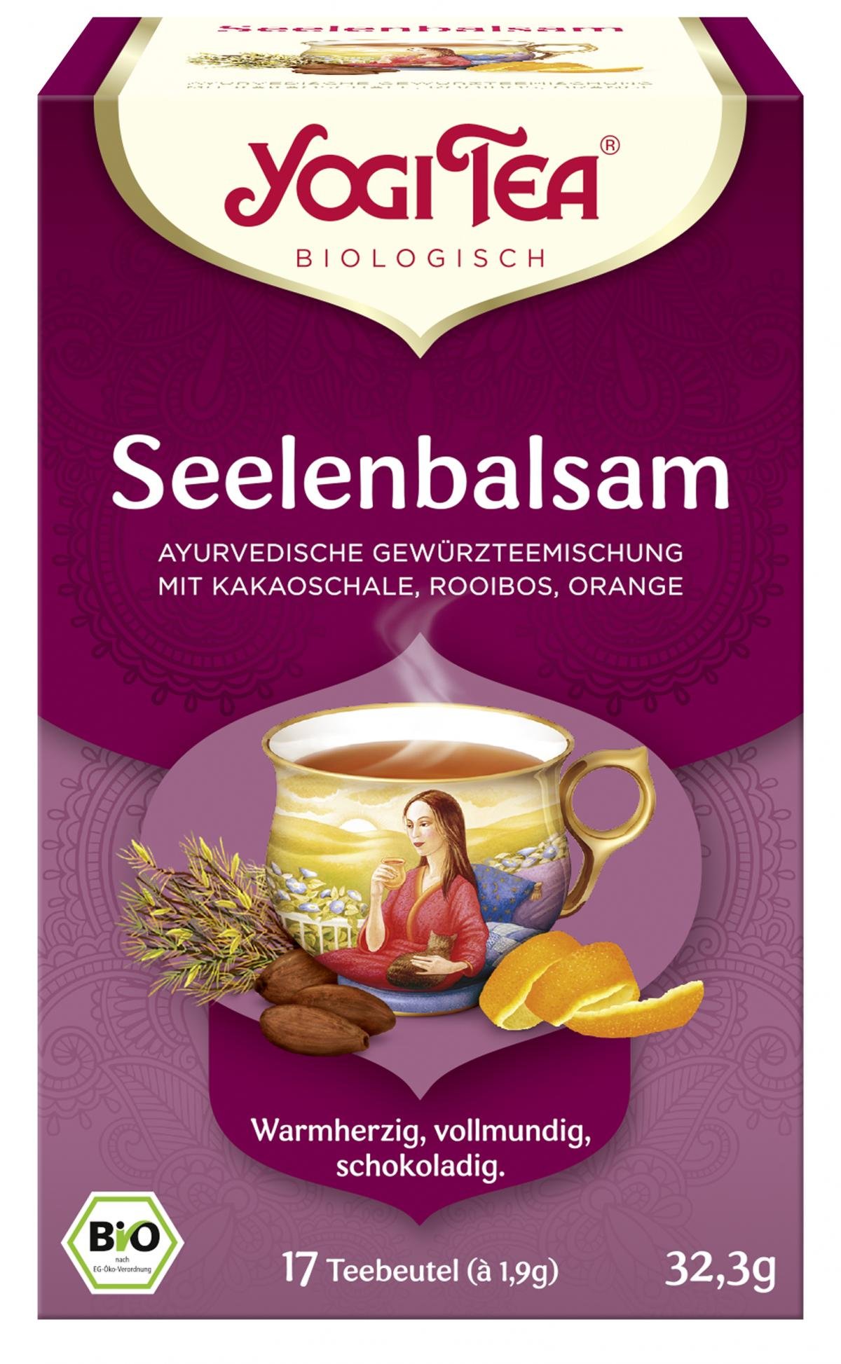 Zimt*, Süßholz*, Kakaoschalen* (10%), Rotbusch* (10%), geröstete Zichorienwurzel*, Hibiskus*, Ingwer*, Anis*, Honeybush*, Orangenschalen* (3%), Karob*, natürlicher Kakao-Extrakt* (2,5%), blaue Malvenblüten* (2%), fettarmes Kakaopulver*, schwarzer Pfeffer*, Orangenöl* (1,5%), Vanilleschoten*, Vanilleextrakt*.