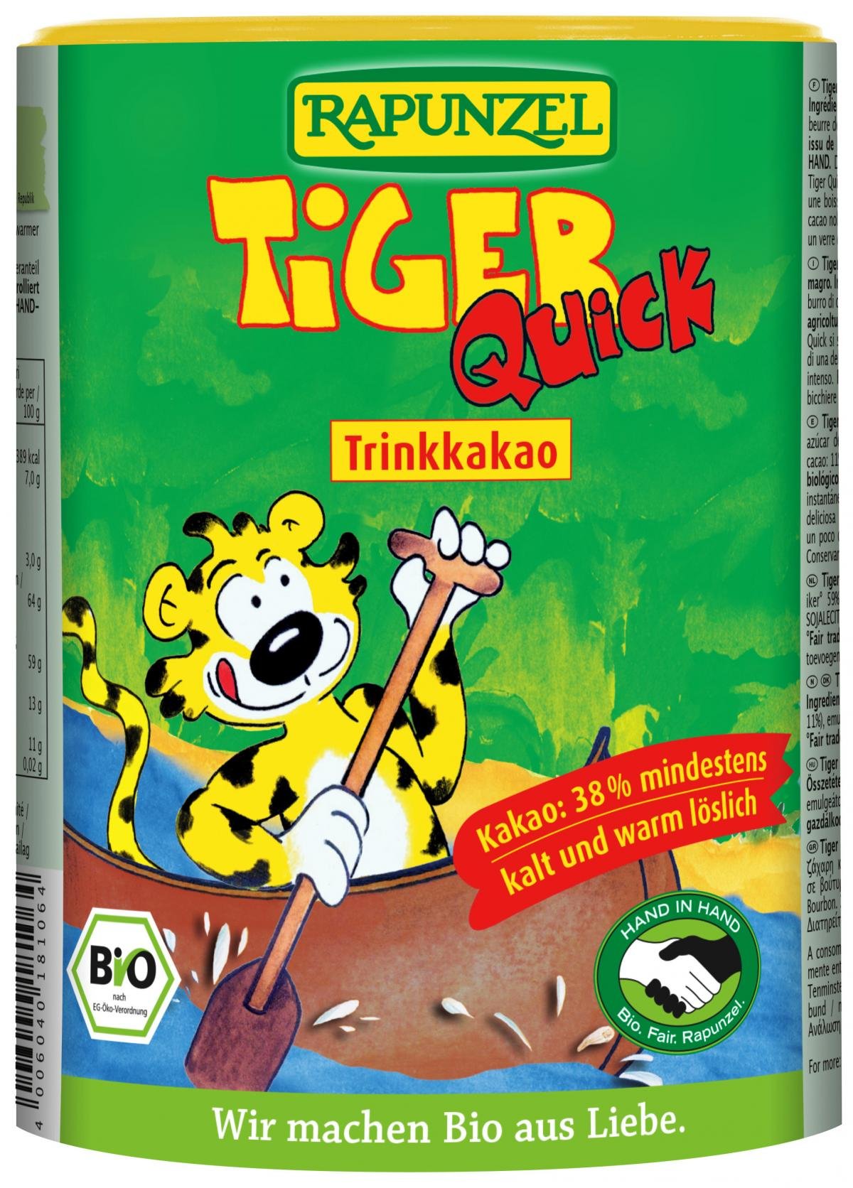 Tiger Quick Trinkkakaopulver - fair gehandelt von Rapunzel HAND IN HAND-Partnern. Herrlich schokoladig durch den besonders hohen Kakaoanteil von 38%. Das Pulver löst sich sowohl in warmer als auch in kalter Milch wunderbar auf.