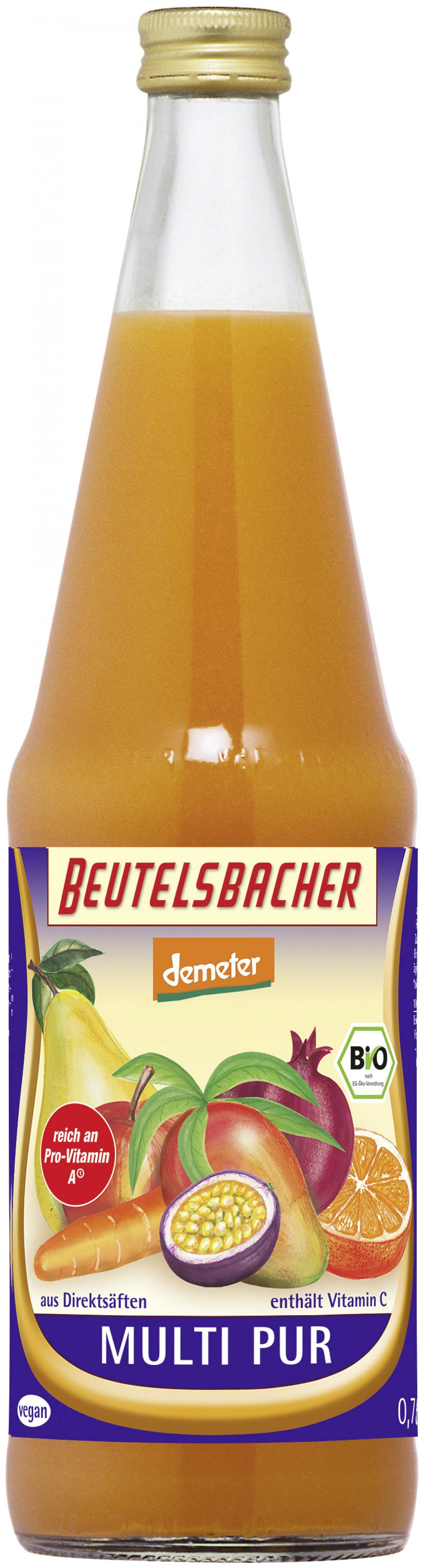Multi Pur ist aus aromatischen Direktsäften. Die tropischen Früchte werden im Ursprungsland schonend gepresst, um das volle Aroma optimal zu erhalten. Unser Rezept mit Direktsäften aus verschiedenen Kontinenten ergänzt Ihr Ernährungsangebot interessant. Unser Direktsaft enthält nur die fruchteigenen Vitamine und sogar Karottensaft aus samenfestem Saatgut. Übrigens wurde Beutelsbacher Multi Pur schon 1996 von der Jury der Ökologischen Weltausstellung IFOAM in Kopenhagen als bestes deutsches Produkt ausgezeichnet.
