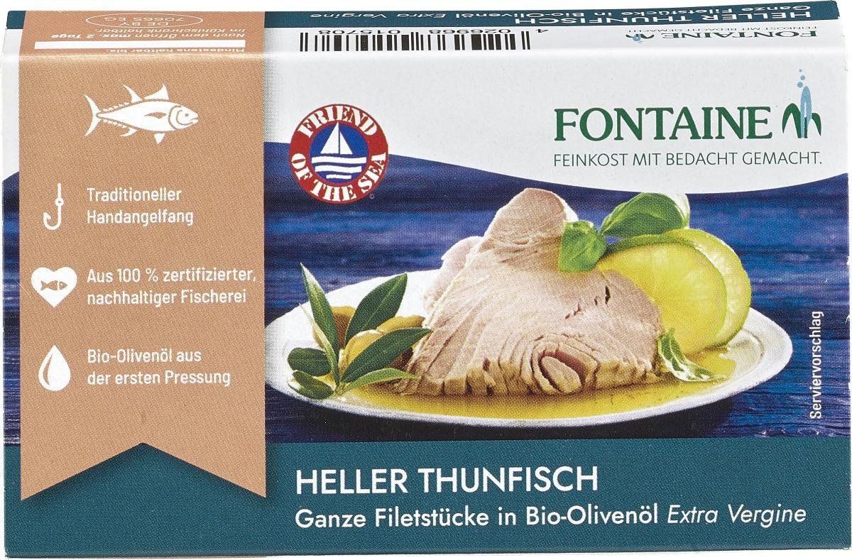 Fontaine Heller Thunfisch wird nach den Richtlinien der Nachhaltigkeit einzeln mit der Angelrute aus dem Wasser gezogen. Nach dem Handangelfang folgen die verantwortungsvolle Verarbeitung und die Verfeinerung mit besten Bio-Zutaten. Diese Vollkonserve enthält neben dem Thunfisch ausschließlich Meersalz und mildes spanisches Bio-Olivenöl extra vergine.